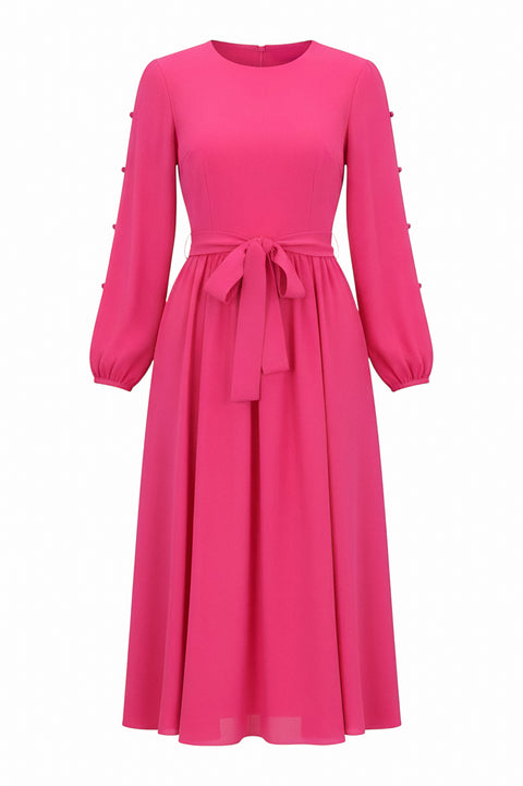 Elevate your wardrobe with this stunning fuchsia midi dress from Mikael Aghal. Designed with long sleeves and a flattering fit-and-flare silhouette, this elegant piece is perfect for any occasion. The waist tie detail cinches the waist for a feminine shape, while the flowing skirt adds movement and grace. This dress features delicate button accents along the sleeves for a touch of sophistication. Whether you wear it to a daytime event or an evening soiree, this versatile dress is sure to make a statement.