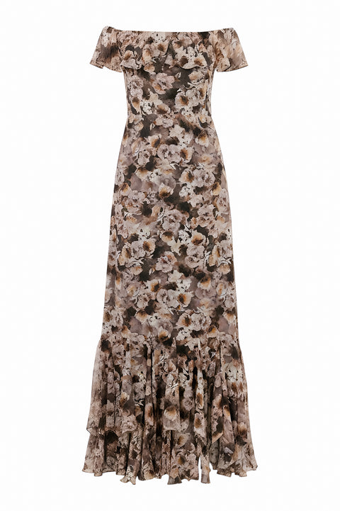 The gown features a flattering off-the-shoulder design, framed by delicate ruffles along the neckline, adding a romantic touch. The form-fitting bodice cascades into a flowing, layered skirt with a ruffled hem that creates a graceful silhouette as you move. The lightweight and breathable fabric ensures comfort, while the intricate floral pattern brings out a sophisticated charm.