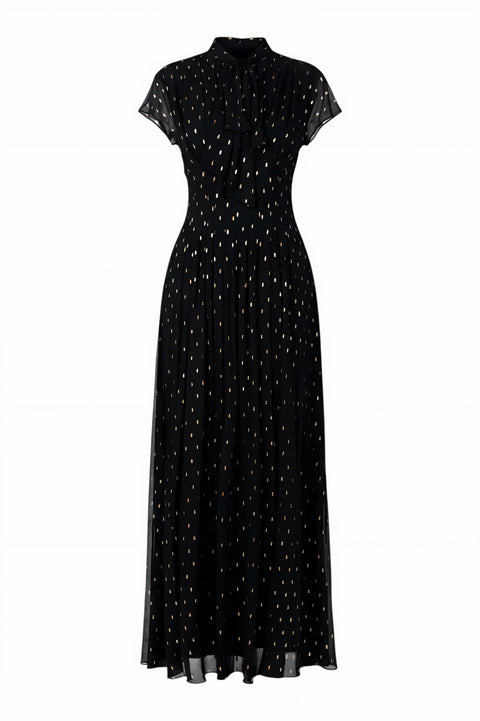 Elegant and timeless, this Mikael Aghal gown brings subtle glamour to evening dressing. Crafted from lightweight chiffon adorned with shimmering gold dot accents, it features a flowing pleated skirt that moves beautifully with every step. The high neckline with tie detail and cap sleeves add a touch of vintage charm, while the fitted bodice creates a flattering, feminine silhouette.