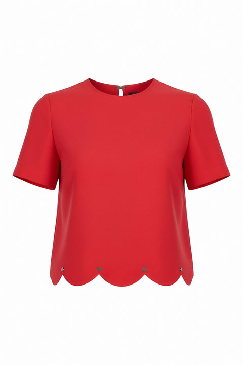 A refined twist on the classic tee, this Valentino crepe top in vibrant red adds feminine charm through its scalloped hem and subtle embellishments.