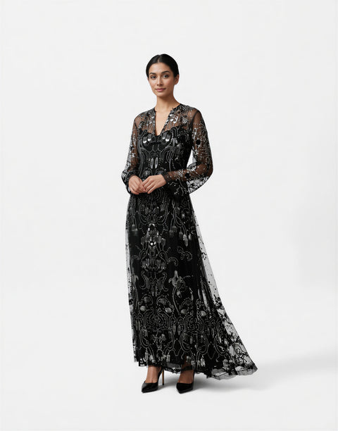 Designed with a flattering V-neckline and long sheer sleeves, the silhouette flows into a floor-length skirt that moves gracefully with every step. The delicate transparency of the outer layer adds elegance without excess, balancing statement detail with timeless refinement.