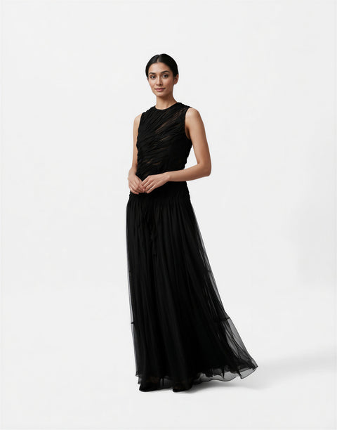The sleeveless cut and high, clean neckline balance the gown’s romantic drape, while the flowing floor-length skirt creates graceful movement with every step. The semi-sheer layered construction adds depth without overpowering the minimalist design.