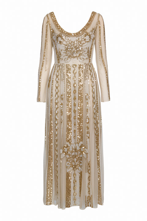 - Bodice: Flattering scoop neckline with floral-inspired gold embroidery.