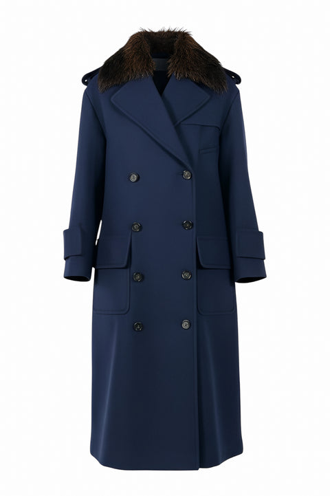Elevate your outerwear collection with this timeless Navy Double-Breasted Wool Coat. Designed to keep you both warm and stylish, this coat features a luxurious fur collar for an added touch of elegance. The structured silhouette, complete with shoulder epaulets and deep flap pockets, ensures functionality without compromising on sophistication. With its military-inspired design and classic double-breasted button closure, this coat makes a statement of modern sophistication.