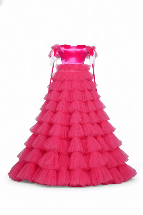 Valentino Off-Shoulder Tiered Tulle Ball Gown in Fuchsia
