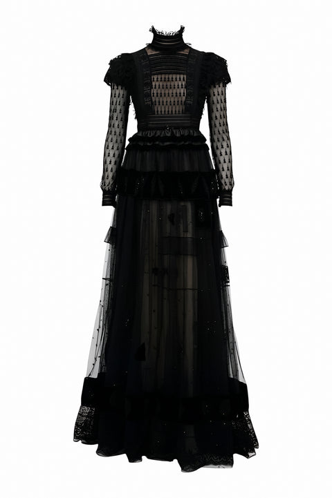 This exquisite black gown from Valentino blends gothic romance with modern couture sensibility. Featuring a high neckline, intricate lace bodice, and sheer tulle sleeves, it creates an ethereal, layered effect. Ruffle trims and velvet accents further elevate the design, while the floor-length sheer skirt offers graceful movement and dramatic allure. Ideal for formal galas, black-tie affairs, or avant-garde soirées.