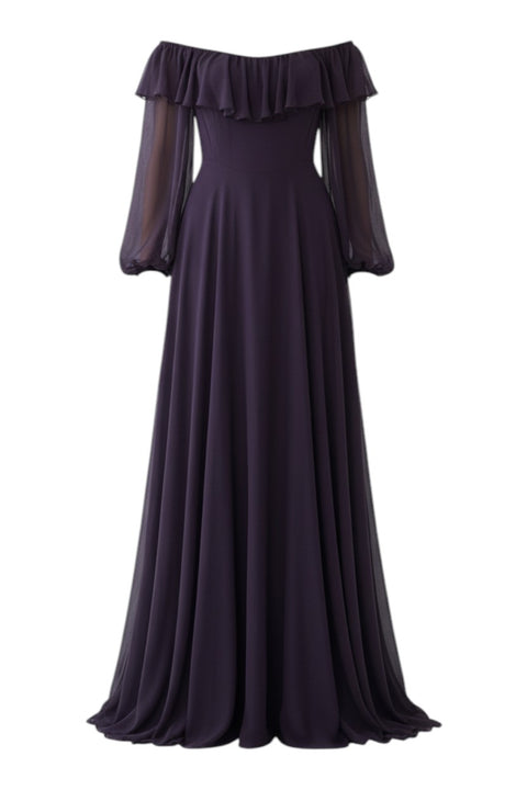 Details:• Valentino• Deep plum chiffon fabric• Off-the-shoulder ruffle neckline• Sheer long sleeves with soft volume• Fitted bodice with flowing skirt• Floor-length silhouette• Lightweight, fluid drape• Made in Italy