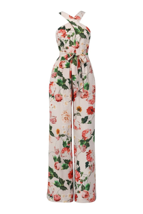 Elegant and modern, this Mikael Aghal floral jumpsuit offers a sophisticated alternative to the classic evening dress. Designed on a soft ivory background with vibrant red and green floral prints, the piece combines bold color with refined tailoring.