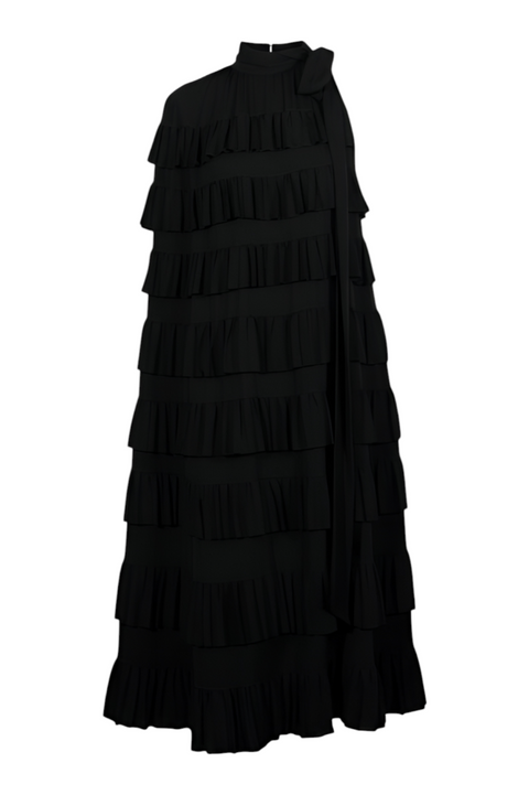 The high neckline with a fluid tie detail adds a touch of refinement, while the flowing A-line shape maintains an effortless, sculptural presence. Perfect for evening occasions, this gown embodies timeless Valentino sophistication — where modern design meets poetic femininity.