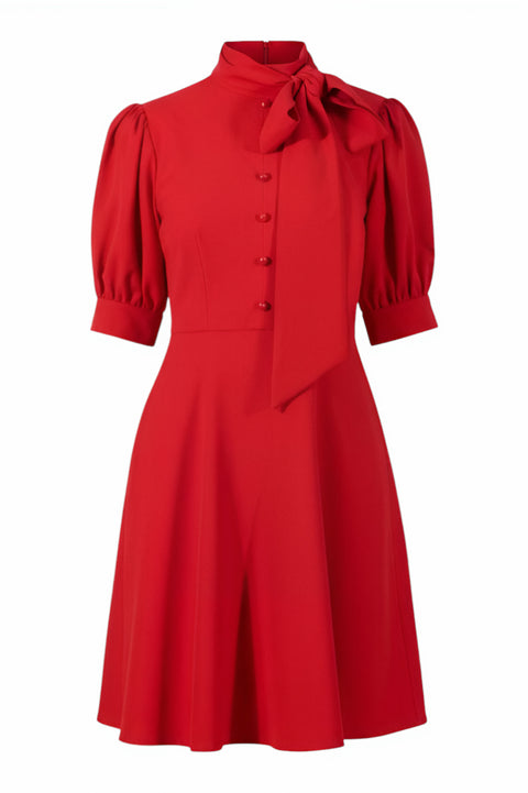 Mikael Aghal Red Crepe Fit-and-Flare Dress with Bow Tie Neck