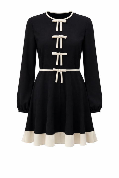 Description:Chic and unmistakably feminine, this Red Valentino mini dress is defined by its signature bow detailing and refined contrast accents. Crafted in classic black, the design is elevated with delicate ivory bows along the front, a matching trim at the neckline, and a contrasting ruffle hem.