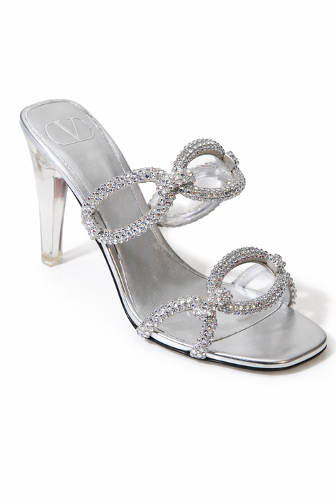 Make a striking statement with these Valentino Garavani heeled sandals, designed in a luminous silver finish and adorned with dazzling crystal-embellished loop straps. The sculptural silhouette features interlocking circular straps encrusted with shimmering crystals, creating a bold yet elegant focal point.