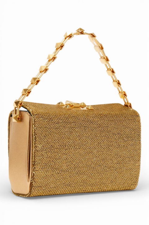 Product Description Radiating statement glamour, this Valentino Garavani Rockstud top-handle bag is crafted in a luminous metallic gold finish that instantly elevates any look. The structured box silhouette is wrapped in finely textured material, complemented by smooth tonal leather side panels for a refined contrast. Signature gold-tone Rockstud pyramid hardware defines the piece, while the sculptural studded chain top handle adds edge and architectural drama. Compact yet impactful, this bag is designed for evenings, special occasions, and moments that call for bold sophistication. The warm metallic tone catches the light beautifully, making it a standout accessory that pairs effortlessly with both neutral and statement ensembles. Details Structured box silhouette Metallic gold textured exterior Smooth tonal leather side panels Signature Rockstud embellishments Gold-tone studded chain top handle Flap closure Compact interior for essentials Made in Italy A collector-worthy Valentino piece that blends iconic design with high-shine elegance.