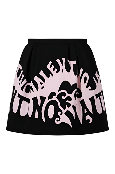 A modern interpretation of Valentino’s artistic heritage, this Valentino Logo Cutout Mini Skirt merges graphic design with couture craftsmanship. The structured black silhouette features laser-cut lettering revealing a soft blush pink underlayer, creating a bold contrast that celebrates the Maison’s iconic logo in an avant-garde style.