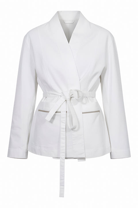 An effortless expression of understated luxury, this Fabiana Filippi jacket combines structured tailoring with casual elements. Crafted in crisp white cotton, the design is softly cinched at the waist with a self-tie belt and features subtle denim-inspired details. A versatile outer layer perfect for refined daytime wear.