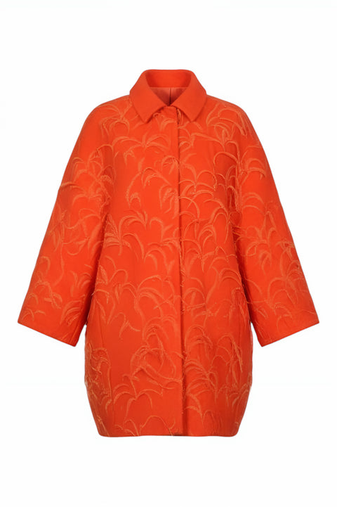 Make a dazzling entrance with this vibrant fiery orange coat, adorned with exquisite feather detailing for a bold and luxurious statement. This eye-catching piece combines avant-garde design with unparalleled elegance, making it a standout addition to your wardrobe.