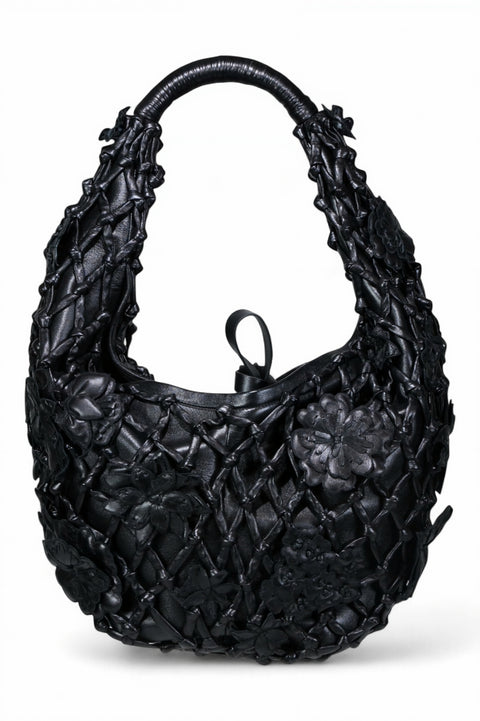 Sculptural and sophisticated, this Valentino Garavani leather hobo bag embodies artisanal luxury. Expertly handwoven in supple black leather, the open-lattice design is adorned with dimensional floral appliqués, each meticulously crafted to highlight Valentino’s couture craftsmanship.