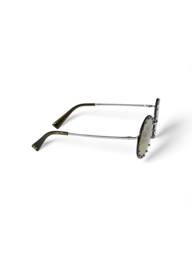 Diese Sonnenbrille von Valentino Garavani bietet einen avantgardistischen Ansatz im Brillendesign und verbindet ausgefallene Ästhetik mit modischem Gespür. Die runden Rahmen sind elegant mit Miniaturnieten verziert, die ein auffälliges Muster bilden, das den Gesamteindruck der Brille verstärkt. Der Metallrahmen sorgt für Langlebigkeit und ein leichtes Tragegefühl, während die glatte, schwarze Oberfläche für einen vielseitigen Look sorgt, der jedes Outfit ergänzt.