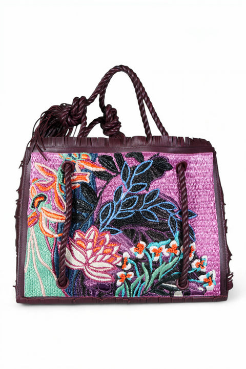 Step into artistry with this stunning Valentino Garavani embroidered tote, where craftsmanship meets bold tropical allure. Woven from vibrant raffia and finished with deep plum leather trim, this bag celebrates texture and color through intricate floral embroidery in shades of violet, turquoise, and coral.