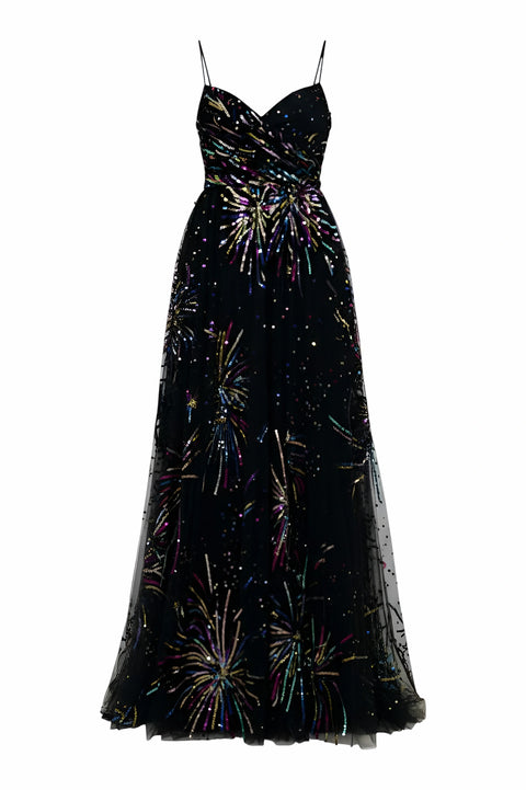 An unforgettable masterpiece from Valentino, this black tulle gown bursts to life with vibrant sequin embroidery in a dazzling firework motif. The structured bodice features a flattering crisscross design and delicate spaghetti straps, giving way to a flowing full-length skirt that shimmers with movement. A celebration of couture craftsmanship and bold evening glamour.