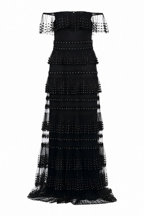 Make an unforgettable entrance with the Valentino Off-Shoulder Tiered Beaded Gown. This stunning evening gown features intricate beaded detailing and a dramatic tiered design, exuding timeless elegance. The off-shoulder neckline enhances its sophisticated allure, making it an exquisite choice for black-tie events, galas, or weddings.