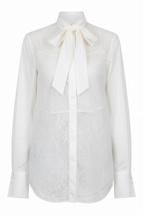 A refined expression of femininity, this Valentino blouse features sheer lace paneling over a silk-cotton blend. The extended bow tie at the collar brings timeless elegance, while the romantic contrast of opaque and sheer textures defines the silhouette. A signature Valentino design that blends structure with softness.