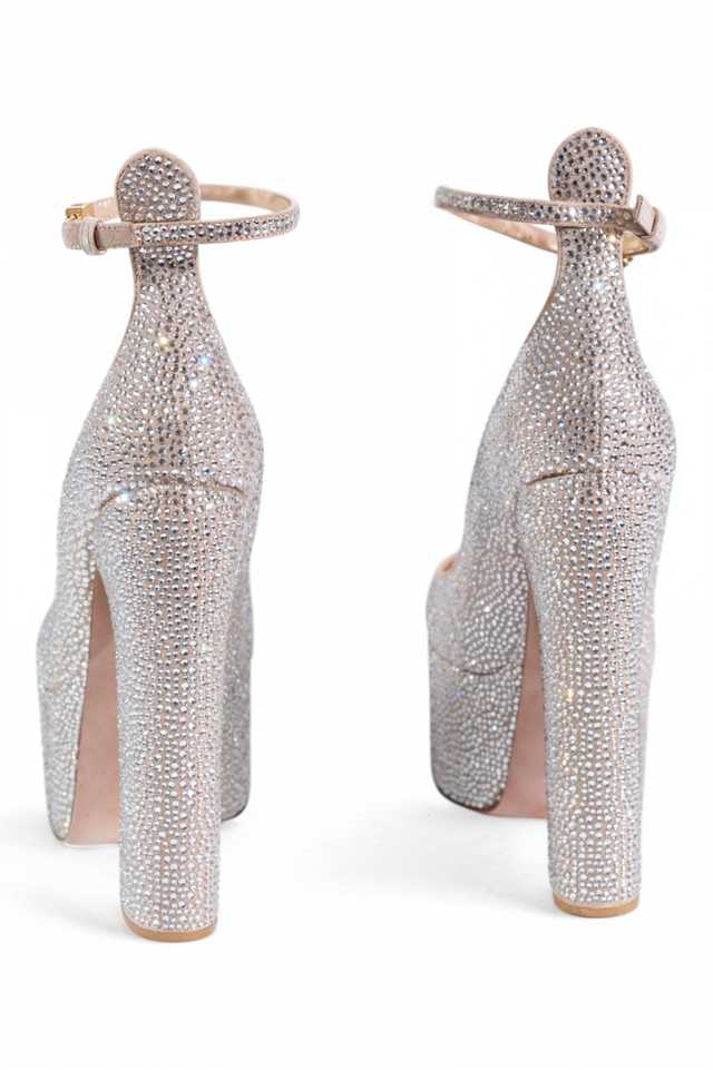 Step into luxury with the Valentino Garavani Tan-Go Crystal-Embellished Platform Pump, a dazzling statement piece designed for those who love bold glamour. Crafted in a soft beige suede base, this platform pump is adorned with all-over crystal embellishments, catching the light from every angle. The block heel and platform design provide both height and stability, while the delicate ankle strap with a gold-tone VLogo buckle adds a refined finishing touch.