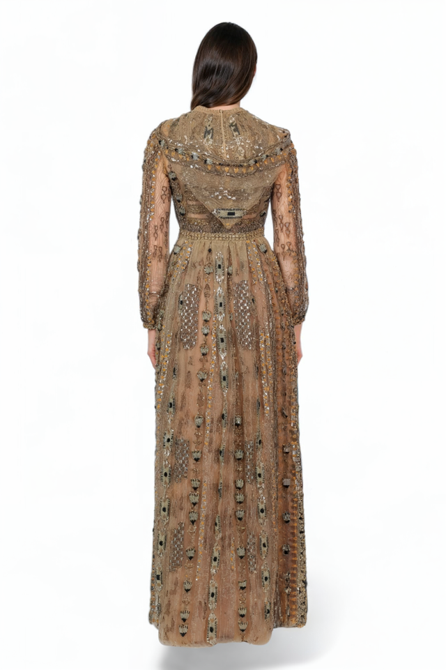 • Sleeves: Long sheer sleeves with detailed embroidery.