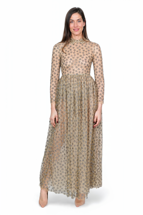 Celestial elegance meets couture craftsmanship in this Valentino sheer gown, adorned with delicate metallic star embroidery. Designed with a fitted bodice, a classic collared neckline, and sheer long sleeves, this gown offers a modern yet ethereal aesthetic. The flowing, semi-sheer skirt adds graceful movement, while the intricate star detailing brings a touch of whimsy and glamour. Perfect for evening galas, special occasions, and high-fashion events, this gown is a true statement piece.