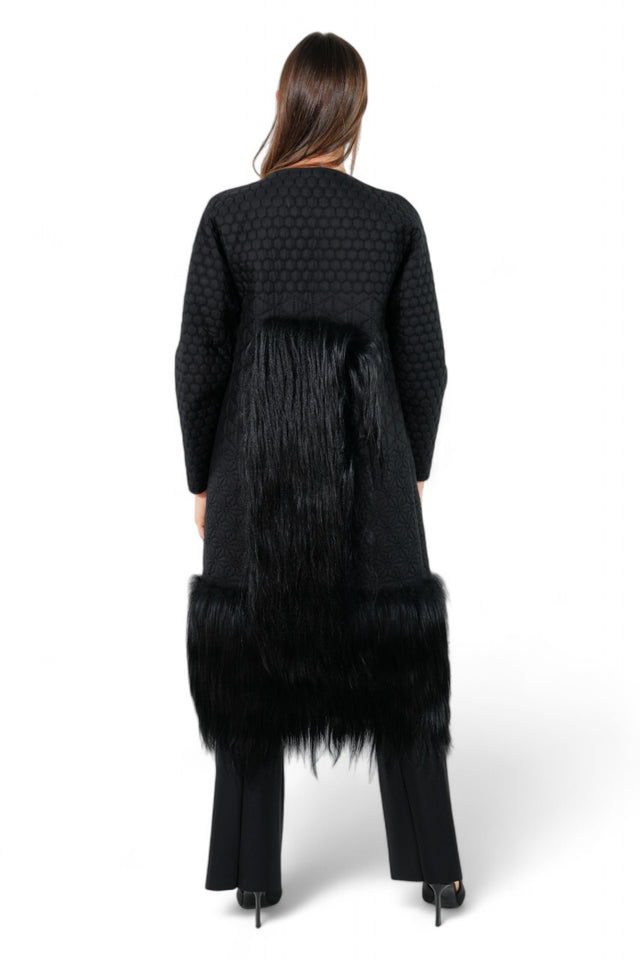 This quilted black coat is more than an outerwear piece—it’s a work of art. The bold contrast of textures and the dramatic fur accents make it a one-of-a-kind design that ensures you stand out wherever you go.
