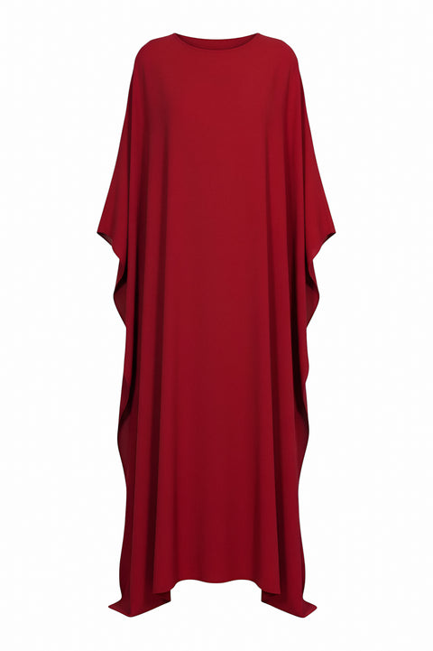 The bold red hue exudes confidence and power, making it perfect for formal events, gala evenings, or high-fashion moments. With its minimalist round neckline and cape-style sleeves, this piece balances understated glamour with striking presence.