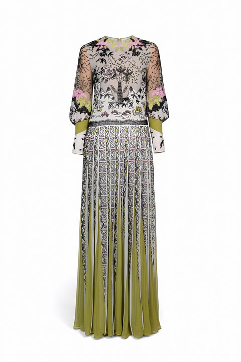 A true celebration of artistry, this Valentino Multicolor Embroidered Long-Sleeve Gown brings an exquisite touch to any formal wardrobe. Intricate embroidery depicting nature-inspired motifs adorns the bodice and sleeves, while the floor-length skirt flows gracefully with an elegant interplay of colors and patterns.