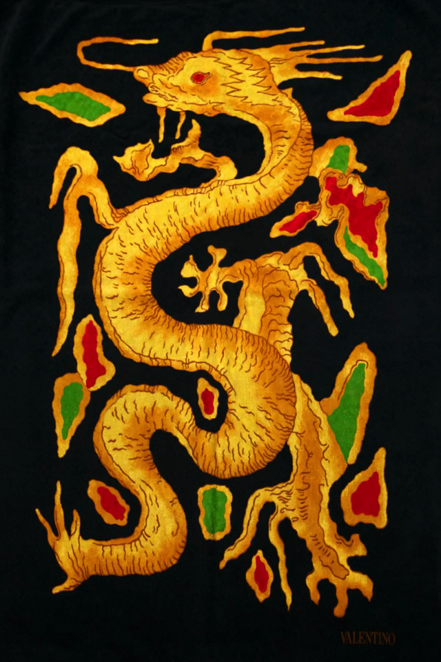 Make a bold and artistic statement with this Valentino Imperial Dragon Beach Towel. The intricate dragon motif, embroidered in rich gold with red and green accents, adds an exquisite touch of luxury and cultural artistry. Crafted from premium fabric, this scarf offers both style and sophistication, making it a unique addition to any wardrobe.
