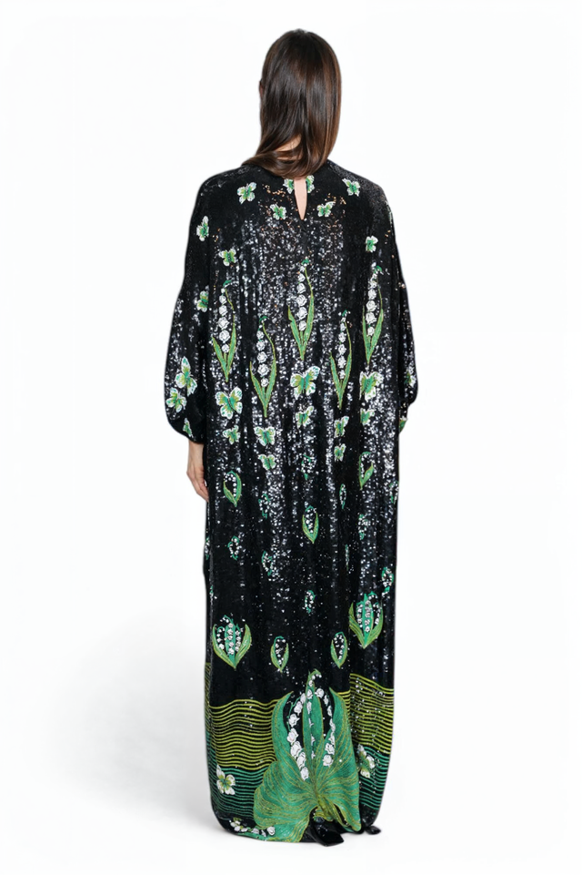 An exquisite blend of glamour and artistry, this Valentino sequined gown is a dazzling masterpiece. Featuring a fully embellished black base with intricate green and white floral embroidery, this floor-length silhouette exudes effortless elegance. The relaxed, flowing fit offers comfort without compromising sophistication, while the shimmering sequins catch the light with every movement. Perfect for gala events, high-fashion evenings, and red carpet moments, this gown is a true statement piece.