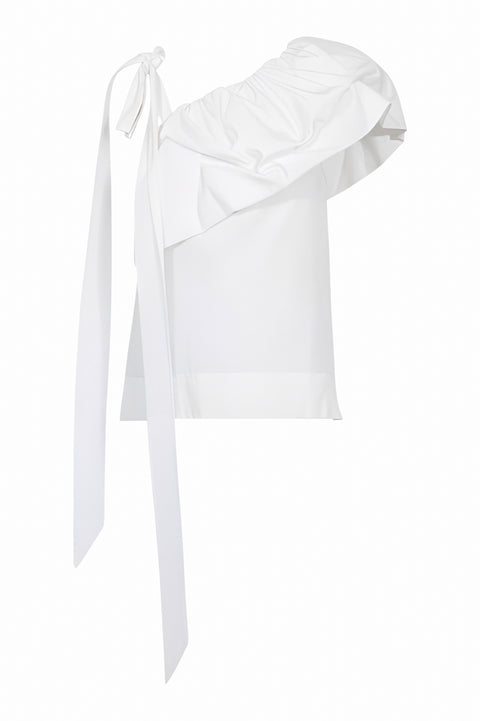 Make a bold and elegant statement with this Valentino one-shoulder white top, defined by its sculptural ruffled neckline and dramatic tie detailing. The asymmetrical silhouette and structured cotton fabric give this piece its modern, artful shape—perfect for styling with slim trousers or a tailored skirt.