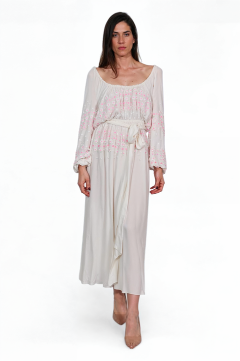 This effortlessly elegant Valentino maxi dress channels bohemian grace with refined craftsmanship. Featuring delicate tonal embroidery and soft pink floral details, it cinches at the waist with a self-tie belt and flows into a romantic, floor-grazing hemline. The wide neckline and blouson sleeves add to its dreamy silhouette.
