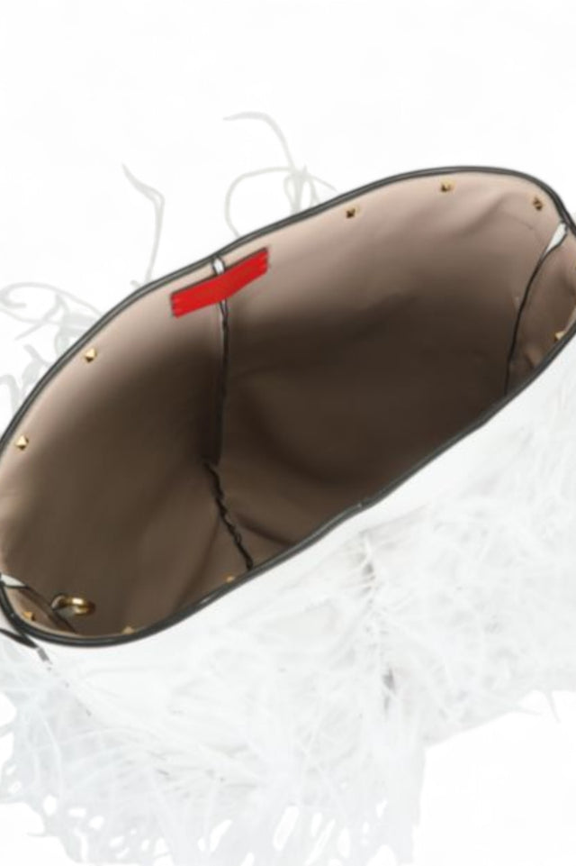 • Structured Bucket Silhouette – With contrast softness from floating feathers