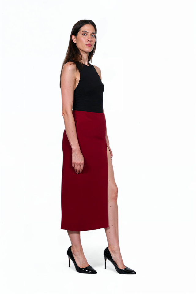 Command attention in this sultry yet sophisticated pencil skirt from Valentino. Crafted in a rich burgundy hue, this tailored piece features a dramatic high slit that adds an alluring edge to its sleek silhouette. Designed to sit high at the waist, the fitted cut hugs the body while the asymmetrical slit offers graceful movement and a touch of bold elegance.