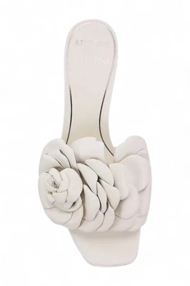 A poetic take on evening elegance, the Valentino Garavani Atelier 03 Rose mule features a sculptural rose crafted from soft leather petals—each one artfully layered by hand. Set atop a slim stiletto heel, this silhouette blends romance with modern refinement.