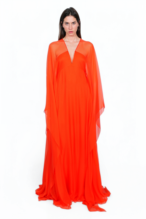 This stunning Valentino orange silk gown exudes bold sophistication. Crafted from luxurious silk, the design radiates a sense of ethereal beauty with dramatic flowing sleeves and an elegant deep V neckline, creating a stunning silhouette perfect for high-fashion events or an unforgettable evening.