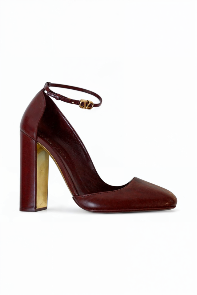 Timeless elegance with a modern architectural twist — the Valentino Garavani VLogo Ankle Strap Pumps feature a bold square heel accented in gold and a refined ankle strap with the iconic VLogo buckle. Crafted in rich burgundy leather, this pump delivers sophistication with every step.