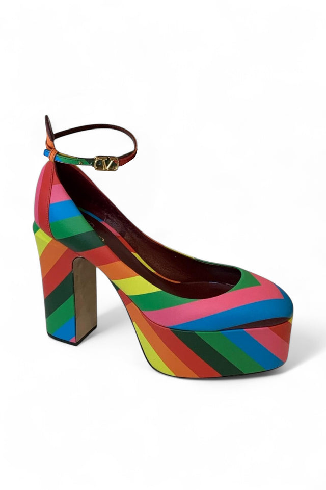 Turn every step into a celebration with these bold Valentino Garavani platform heels. Covered in vibrant diagonal rainbow stripes, this eye-catching design features a retro silhouette elevated with signature Italian craftsmanship.